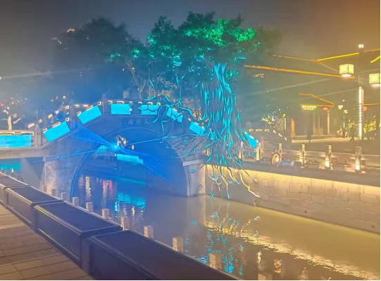 燈貿(mào)集團承制的“鹽鎮(zhèn)水街最鹽城”系列彩燈,令游客領(lǐng)略到“夜色闌珊迷人,漿身燈影悠然”的和諧美好繁華景致。華燈搖曳,游人如織,移步天水橋,紡著潺潺夜色,一式的明清風(fēng)味的青磚黛瓦樓閣,夜幕下燈火璀璨。