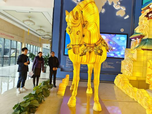調研組一行參觀了東方彩燈(出口)基地,觀摩了燈貿(mào)集團將自貢彩燈與唐三彩兩種非遺技藝的全新融合的“唐風華韻”展品。集團執(zhí)行總裁陶建軍向調研組一行介紹了燈貿(mào)集團發(fā)展狀況,以及公司全新彩燈產(chǎn)品。公司為促進彩燈產(chǎn)業(yè)的創(chuàng)新性轉化和創(chuàng)造性發(fā)展,推出了文化+創(chuàng)意+科技全新彩燈產(chǎn)品,產(chǎn)品深度挖掘文化底蘊動線,變被動式觀燈為主動式沉浸、行浸觀燈,燈展的供給創(chuàng)新能力和消費場景獲客能力得到了較大的提升。