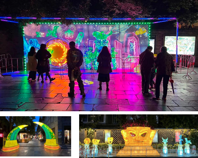 由成都金沙遺址博物館和成都寬窄巷子聯(lián)合主辦,自貢燈貿集團承制的“古蜀文明彩燈光影藝術展”于近日璀璨亮相。燈展以太陽神鳥金飾、黃金面具、青銅立人等古蜀金沙文化元素為創(chuàng)意主題,在國家非物質文化遺產傳統(tǒng)彩燈基礎上,創(chuàng)新性地融合光影投幕、機械傳動、互動投影和玻璃鋼材質等,為游客營造出亦真亦幻,科技感與未來感十足的古蜀光影之夜。