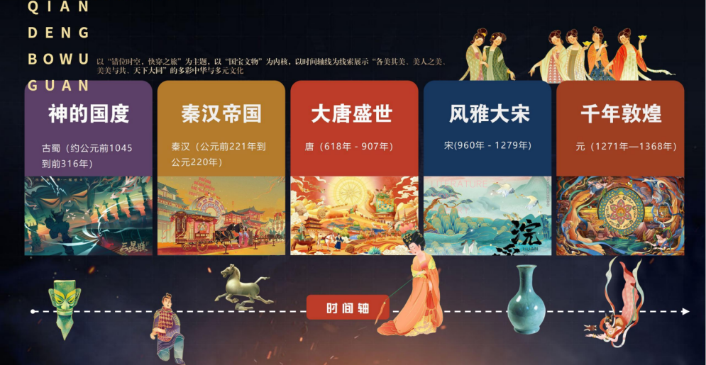 自貢燈貿(mào)集團承制的第29屆自貢國際恐龍燈會《千燈博物館》燈組以“錯位時空,快穿之旅”為主題,以“國寶文物”為內(nèi)核,以時間軸為線索展示“各美其美、美人之美、美美與共、天下大同”的多彩中華與多元文化。用故事化、場景式的方式讓游客體驗文物背后的文化,仿佛身臨文物當(dāng)年的時代。